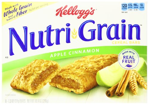 Low on calories, high on nutrition, Nutri-Grain Apple Cinnamon Cereal Bars get you on track with energy in a quick and easy package. Made with a soft, golden baked crust of wheat and whole grain oats and filled with real apple puree and cinnamon, Nutri-Grain Cereal Bars offer flavor everyone will love. Not only do Apple Cinnamon Nutri-Grain Bars taste great--they are packed nine essential vitamins, eight grams of whole grains, three grams of dietary fiber, and two grams of protein--in each bar. Whether you start your day with a Nutri-Grain Cereal Bar, add it to your child's lunch box as sweet nutritious treat, or enjoy it as a mid-day snack, Apple Cinnamon Nutri-Grain Bars offer more of what your body needs to live well and help you eat better all day.
